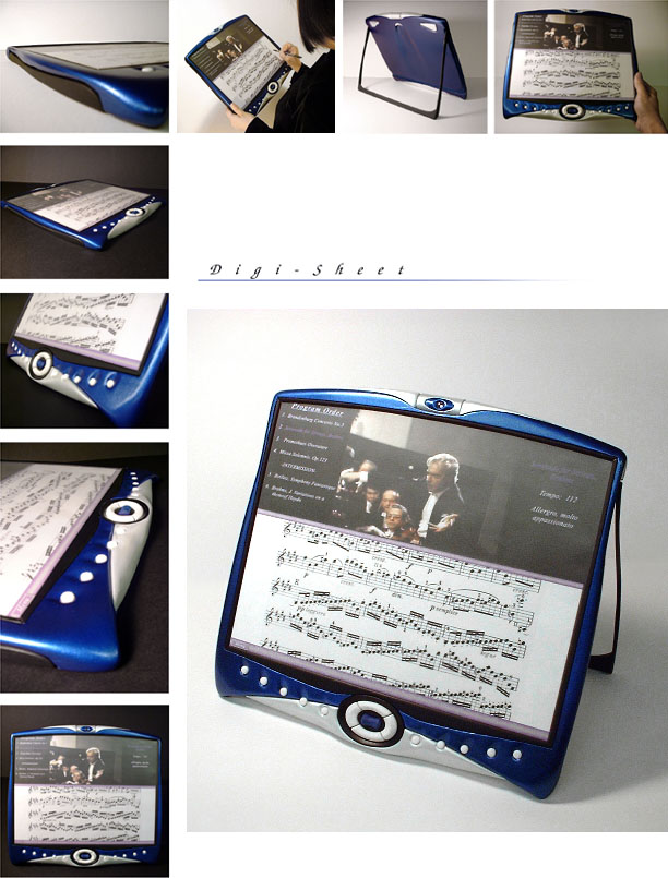 A black frame or inlay is selected to reflect the black wood on stringed instruments, located on fingerboards and a few wind instruments.   The wood acted as a non-reflecting element so that full attention to the screen in the dark is be achieved   The main body made from a lightweight metal to resemble the metallic music stand.   The colors are dark, blue or an olive green to echo and compliment the natural colors of the red/orange wood used to create instruments.   Dark colors are also apparent in case designs for instruments.   The matted silver portion of the product spiced up the product and related it to band instruments more.  The silver also mirrored the silver seen in many portable music stands.   The buttons are a slight opaque white, allowing the option for dimmed buttons to be better seen in the dark.   The screen has the option of being a touch screen but buttons are left since consumers in the music industry felt more comfortable using actual buttons.   Ten buttons are selected in order for a musician to quickly access any measure in their music.  A large scroller is added to easily scroll through music.  The camera lens is protected by spinning the adjustable lens downwards into the body, therefore protecting it and also acting as an on/off portion for the camera.   The hinged-hooks to slide the Digi-Sheet onto the top of a music stand is triggered by a simple release button located on the top central region of the back portion.